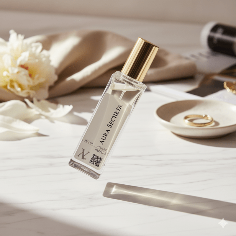 Inspirado en Alien – Thierry Mugler, Aura Secreta no es una copia… es una revelación intensificada. Flores solares, maderas de cachemira y un fondo de ámbar blanco que perdura como un susurro eterno.